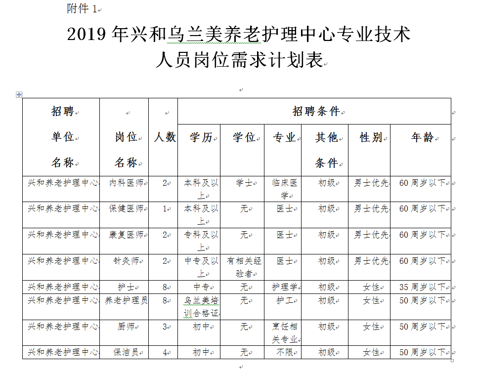 5.戶籍要求截止到2018年11月30日前為烏蘭察布市戶籍。(詳見附件1:2019年興和烏蘭美養(yǎng)老護(hù)理中心專業(yè)技術(shù)人員崗位需求計劃表)。